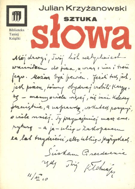 Sztuka słowa : Rzecz o zjawiskach literackich. / Julian Krzyżanowski. - [Wydanie 3]. - Warszawa : Wydawnictwo Artystyczne i Filmowe, copyright 1984. - 303, [1] strona : fotografie ; 16cm.